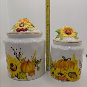 Bring the warmth of autumn into your kitchen with this charming Farmwood Valley Fall Harvest Canister Set by Spectrum Designz! This beautiful ceramic set features vibrant sunflowers and cheerful pumpkins, perfect for adding a touch of seasonal charm to your home decor.