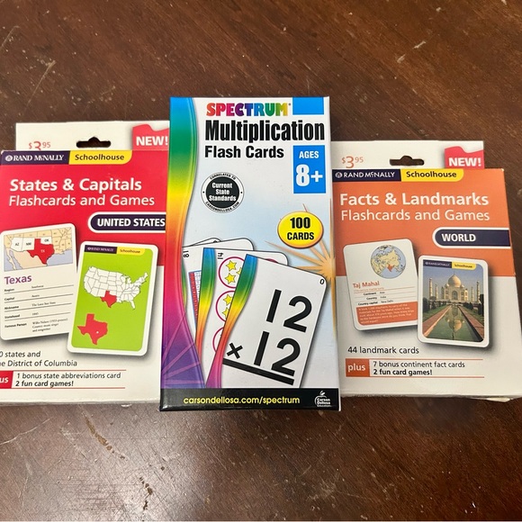 Boost your child's learning with the Spectrum Educational Flash Cards Set. This vibrant collection includes multiplication, states, capitals, and world facts cards, making education fun and interactive.