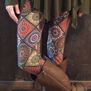 Multi-colored, spectrum print leggings. Super soft brushed knit with good stretch!