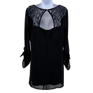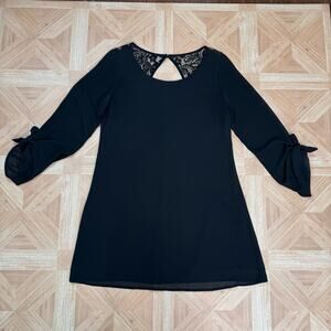 Speechless black lace-back shift mini dress in juniors' size medium. This dress features a scoop neckline, roll-tab long sleeves, and a beautiful lace back detail. Lined for comfort, it offers an easy, elegant silhouette perfect for various occasions.