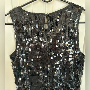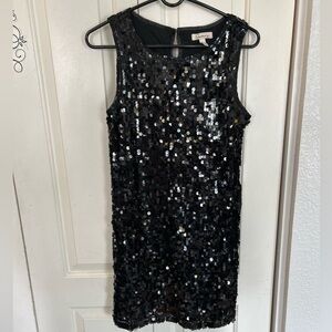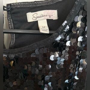 This is a Speechless black sequin shift dress in size medium. It features a sleeveless design with a round neck and button closure. The knee-length dress is made of polyester fabric with sequin accents, suitable for occasions like travel, weddings, parties, and formal events. It is lined and suitable for wearing in winter, summer, fall, and spring.