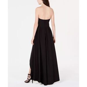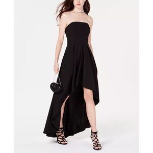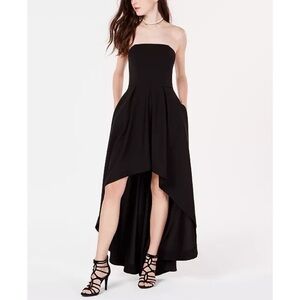 A fierce high-low skirt falls from the strapless bodice on this formal dress from Speechless, styled with boning at the bodice and some very cute on-seam pockets.