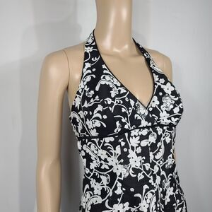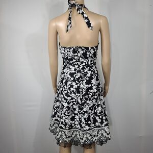Very pretty black and white floral-patterned halter-style dress with clusters of silver sequined embellishments.