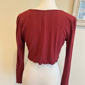 Chic burgundy cardigan with ribbed texture. Features a tie-front design. Perfect for layering.