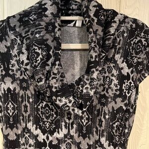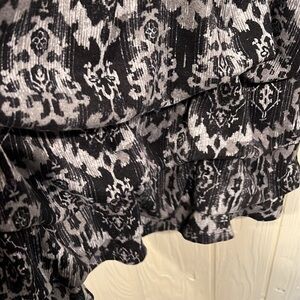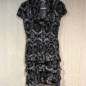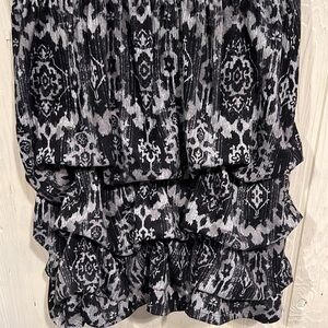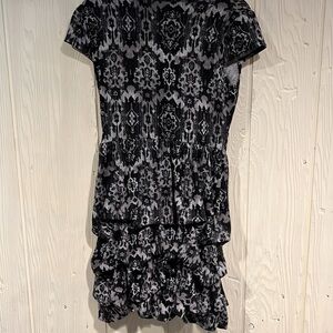 Black and gray Speechless dress with cap sleeves. The bottom has a bubble hem. There are belt loops, but no belt is included.