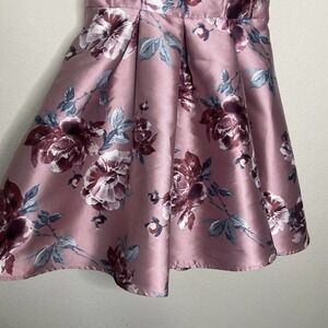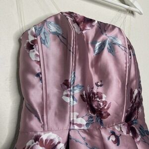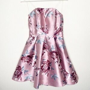Adorable dress by Speechless. Strapless fit and flare with a floral print in shades of pink, white, green, etc. Interior boning and rubber strip at top for added support and a corset look. Center back invisible zipper closure. Lined. So pretty!!! All measurements are approximate, taken flat and closed.