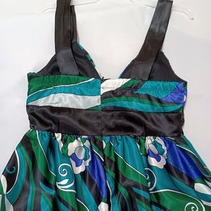 Ruffled Tulle black bottom trim that is attached to black half slip style lining Empire waist Back hidden zipper Black shoulder straps and empire waist Florals and swirls of black, white, teal, purple,gray and green 100% Polyester, Machine wash cold Very good pre-owned condition