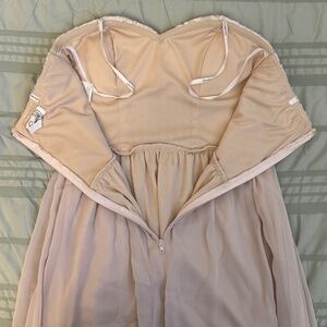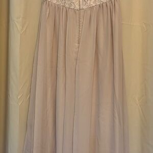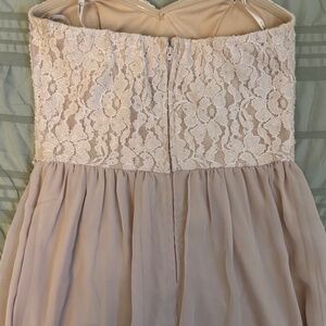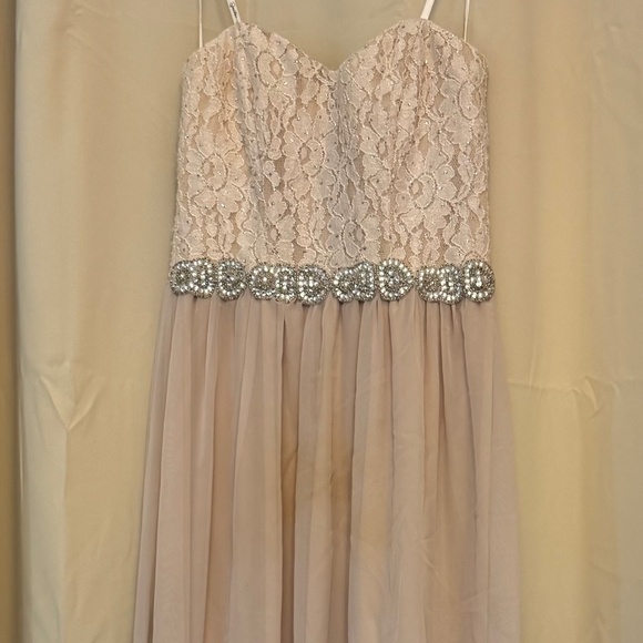 Pretty strapless formal dress with ivory lace bodice, embellished waistline, and flowy chiffon skirt. Perfect for special events or dress-up occasions.