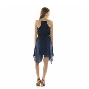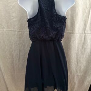 Speechless, lightweight, navy blue handkerchief dress, lace bodice, flowy chiffon like skirt, square racer back, fully lined, adjustable straps, scoop neckline, elastic waist band, 100% polyester, approx 35” from shoulder to hem, missing belt, size S, excellent preloved , like new condition.