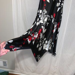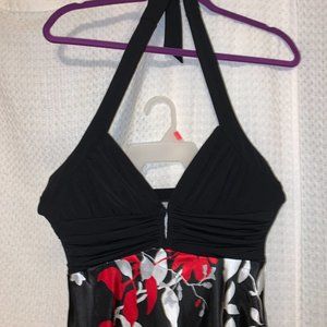 This is a long black halter dress with a handkerchief hem made by speechless. I bought this at a second hand store and had no idea they cut the breast part out of the dress, not jut the padding, but slashed the inside of the dress pretty good. I'm sensitive to things not being "normal" with clothes and I can't wear it as it irritates me, even with a Bra on. This fits more like a Medium/Large but the tag is too worn to see what size it actually is. I tried to wear this once had it on for 10 minutes total before I had to take it off. I also can't wear lace and certain other fabrics due to how it irritates my skin. If you have allodynia and fibromyalgia like me you would understand.