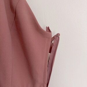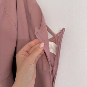 Beautiful back, high neck line. Side zipper, top of zipper needs to be sewn down. High slit with lining to top of slit.