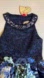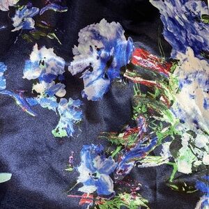 Elegant navy dress with floral pattern. Sleeveless design & it has hidden side seam pockets. Lace sparkle bodice with beaded neckline. Dress is maxi length with navy lining & tooling to help skirt of dress be full. Back zipper & sides to back strips of fabric to tie bow. Floral print is white, blues, green & touch of red. Perfect for a special party or formal occasions. Content of shell is 90% Polyester & 10% Spandex. Lining & contrast are 100% Polyester. Measurements flat are approximately 11.25” waist, 12.5” pit to pit & 42” long. In excellent new condition with NO spots or damage. NWT