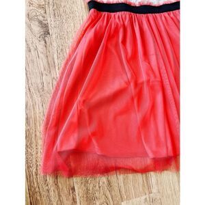 Beige geometry top, with salmon color tulle bottom. Features an exaggerated long black zipper on back to match the black waistline. Satin lining on skirt, which stops fairly high on your leg (thigh) with only an extra 2” of tulle. Very cute & sexy!