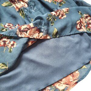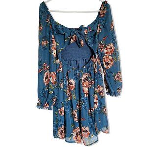 Get dressed up in this beautiful floral dress from Speechless. It has such a beautiful blue color with adorable flowers pattern on them. It has a cute tie up bow in the back with a lovely cut out in the back. Puff transparent sleeves with a cute ruffle cuff at the end of them. It is lined. This dress is shorter and will hit above the knee depending on height.