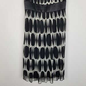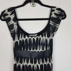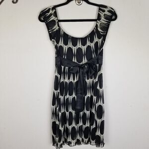 Pretty scoop neck dress in black and off-white with a shiny black tie in the back bow; a black lining; and sheer see-through shoulders!