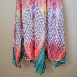 Speechless handkerchief dress, size 10. Sleeveless. Lined laced top. Colorful, geometric sheer overlay (purple, yellow, orange, blue, green) with lined skirt. Stretchy waist. Pull-on style. 🌻 Sale item--see last picture for more details.