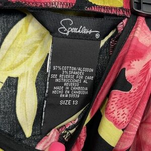 Speechless Womens Dress 13 Black Green Pink Floral Print Stretch Back Zip Knee Length Fit & Flare 97% Cotton Summer Party Pretty EUC