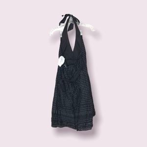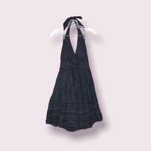 Elegant backless dress with a dotted pattern. Halter neckline and flared skirt. Ideal for stylish outings.