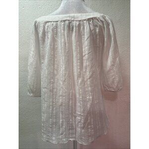 This Women's Lots of Love by Speechless V Neck Blouse in size L is a stylish and versatile addition to any wardrobe. The off white lace and embroidered accents add a touch of elegance to this tunic-style blouse, perfect for casual occasions in the spring, summer, or fall. Made of breathable cotton knit fabric, this pullover blouse features a round neckline and 3/4 sleeves, making it comfortable and easy to wear. The off white color and love-themed design make it a charming choice for any season.