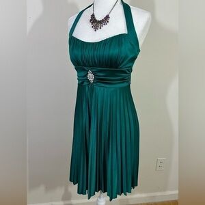 Attractive emerald green dressy dress. The top features a tie around the neck with a gathered bust line. The top has a bra like interior Below the bust line is a band with the pin attached The band ties in the back with a generous bow. The waist is slightly raised and the skirt has a pleated effect that has the permanent pleating. The skirt part is a single layer of fabric. Measurements pit to pit flatfold about 18”. The measurement from under the armpit to bottom of dress measures about 30”. The length is to the knee or slightly below. No visible flaws. Questions please ask and we will answer ASAP