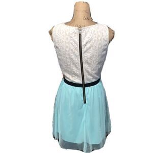 Beautiful dress, top is lace over a nude lining and bottom is green tulle over a lining. Zips up the back. In good condition