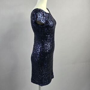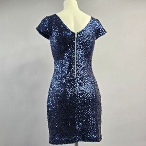 Dazzle in this navy sequin mini dress. Perfect for parties and special events. Short sleeves and fitted silhouette.