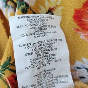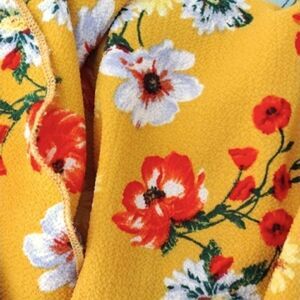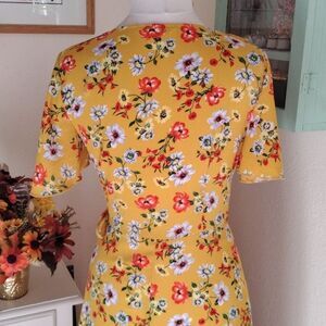 This beautiful yellow crepe-like fabric is sprinkled with flowers. Bright and sunny, all year wrong. Fluttery sleeves. True wrap front and ties. Size M measures 35 at chest, 28 at waist, 40 at hips, 51 long from shoulder to hem. A small repair on the right back that doesn't show. I love this dress, I hope you do too.