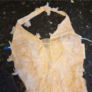 Dusty peach gown with halter top, zip back, mesh covering in chest area. Beautiful, flowy detail with flowers sewn on, that resemble butterflies.Brand new with tags, never worn. Size 11.