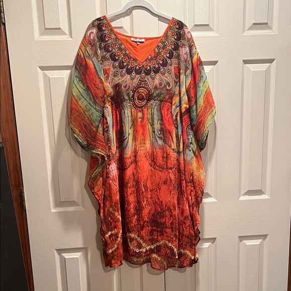 Eye-catching tunic with a bohemian design. Features vibrant orange, green, and red patterns. Ideal for a unique style statement.