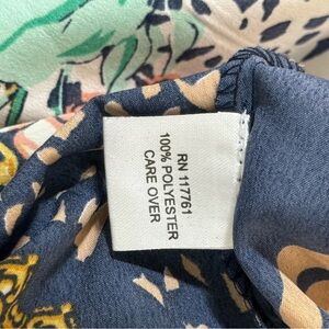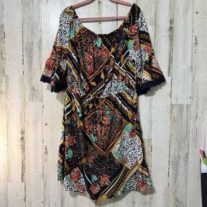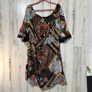 Stylish dress with a vibrant patchwork pattern. Features a mix of floral and geometric designs.