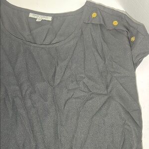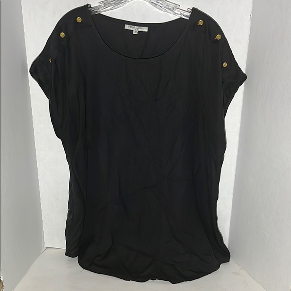This black blouse from Speed Limit 98 features a relaxed fit with cap sleeves and a buttoned front, offering a stylish yet comfortable look. The soft fabric drapes beautifully, making it a versatile addition to any wardrobe.