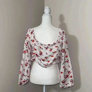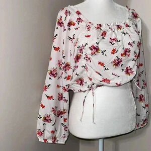 Boho style gets modern touches in this floral cropped top from Speed Limit MPH, featuring drawstring details.