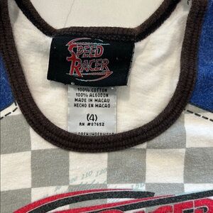 This Speed Racer kids tank top features a vibrant design with a blue and white color scheme. Perfect for young fans, it offers comfort and style for everyday wear. Size 4. Used good condition, see photos for more details.