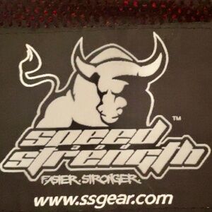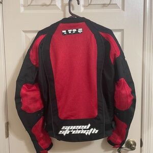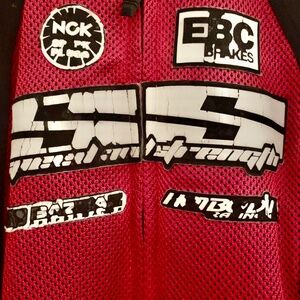 Size small red and black motorcycle jacket with padding. Full disclosure: There is a lot of wear and tear to the patches and logos. Please inspect pictures carefully before purchase.
