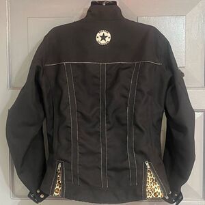 Protective Motorcycle Jacket With Embroidered Arms , Jeweled Pull and Leopard Print Lining. Light wear used condition