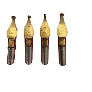 Box has minor wear from age. Nibs and pen holder in excellent condition. Box dimensions: 7.5 x 3.5 inches.