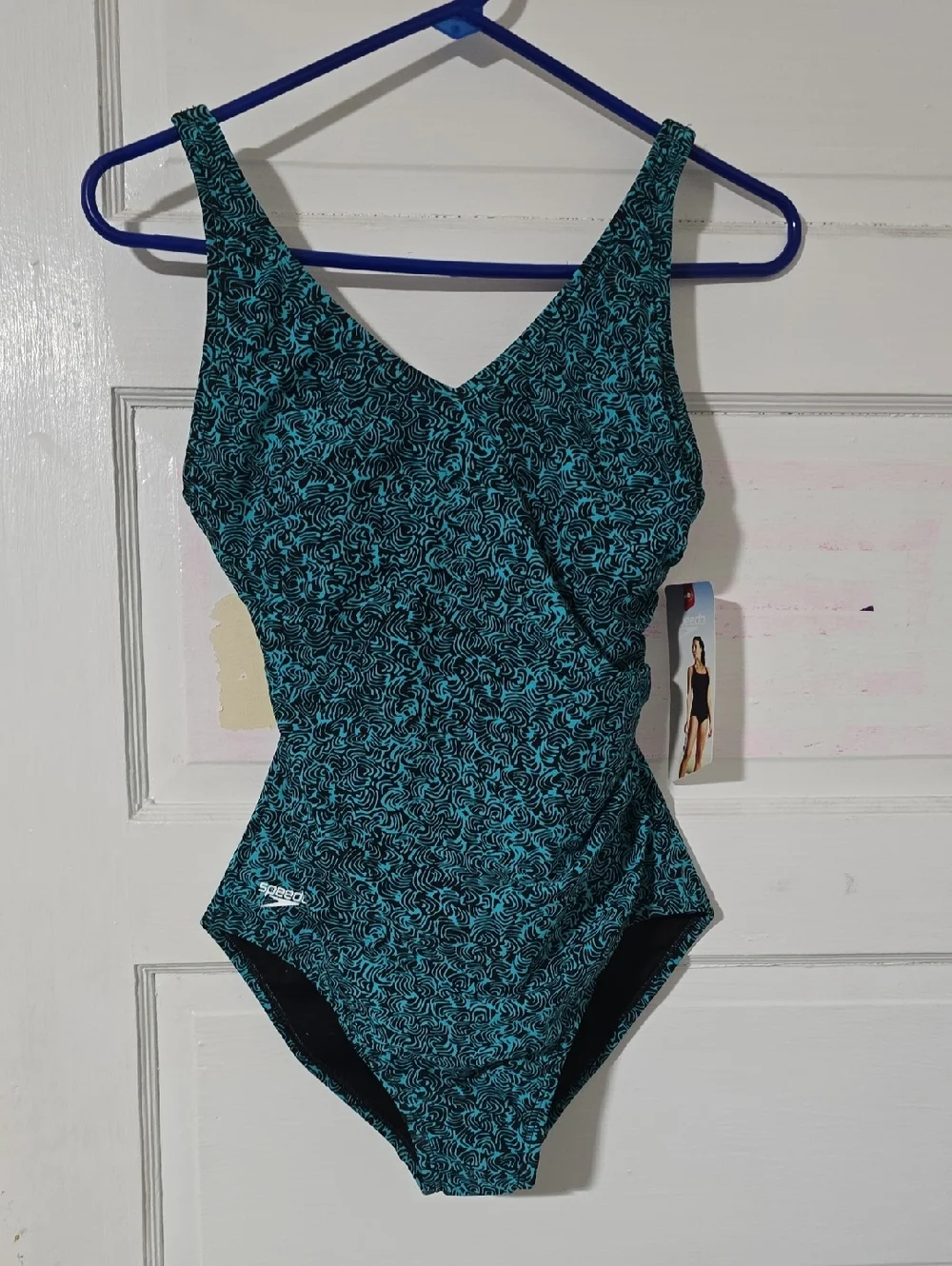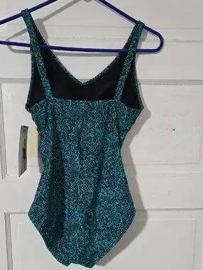 Speedo one-piece swimsuit in a teal swirl pattern. Designed for reliable coverage and comfortable support. V-neck front with wide straps for secure fit. Quick-dry, chlorine-resistant fabric for pool use. Teal patterned color adds a stylish, athletic look.