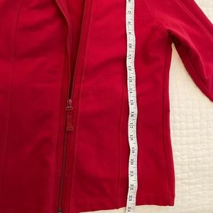 Mid weight, red athletic jacket by Speedo. Size small, but runs big. It has two front pockets. Fabric is heavy, soft cotton with Spandex. Never been worn. Great condition! Pet-free, smoke-free house.