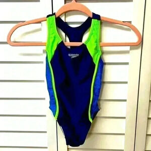 Speedo equals better fit, performance, quality, and innovation. The girl's 7-16 infinity splice one piece is a popular athletic styled basic that is great for young swim team enthusiasts or for any water activity. The suit features trademarked xtra life lycra which lasts 5 to 10 times longer than traditional lycra. So no bag and sag, and it looks like new for longer. With bold colorblock details, it also offers our new no wedgie worries technology, which adds a thin silicone gripper at the inner edge of the bottom to keep the suit in place during activities. Look and feel your best in or out of the water, while you play, train or win in speedo, the choice of champions. Features: 80% Nylon/20% Lycra Hand Wash Xtra life lycra fabric lasts 5 to 10 times longer to give you more value for your money Resists bagging, sagging, and the effects of suntan lotion, skin oils, and chlorine No wedgie worries silicone gripper at leg openings for stay put coverage Sporty thick strap racerback styling for an improved fit and secure comfort