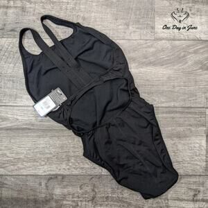 A most elegant Speedo Endurance+ Super Pro Solid One Piece Swimsuit in a becoming black hue, perfect for the accomplished lady who delights in aquatic pursuits. This fine garment, crafted of superior polyester and spandex, promises both durability and comfort whilst maintaining a pleasing silhouette in the water, and arrives in pristine condition with its original markings still affixed.