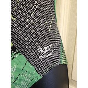 Elevate your swimwear game with this stylish green and black one-piece Endurance swimsuit from Speedo. Designed for women in size 30, this swimsuit features a geometric pattern and comes with a racerback strap type. The material is made of durable polyester and comes with fixed straps, scoop neck, and a branded logo accent.