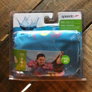 Brand new in the sealed box. Speedo Fabric Armband Swimwear kids age 2-12 years. Swim Level 2. Sealed Plastic Box is a little damaged but inflatable swim armbands are in tacked. Blue with yellow Speedo lettering and purple, pink, & green splash detail. Just inflate and swim!