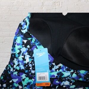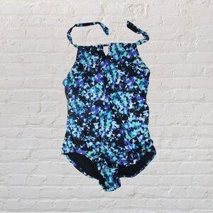 Blue and black floral speedo halter.
