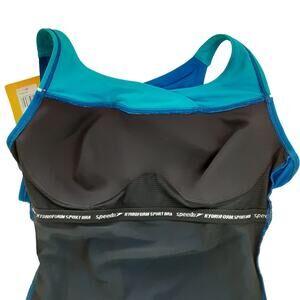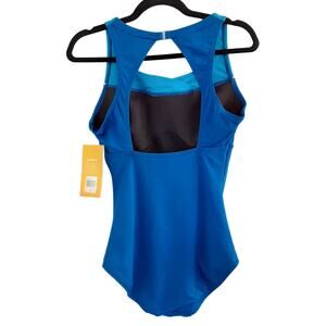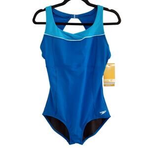 Speedo High Neck Piped One Piece Swimsuit Dusk Blue Open Back Womens 10 NWT