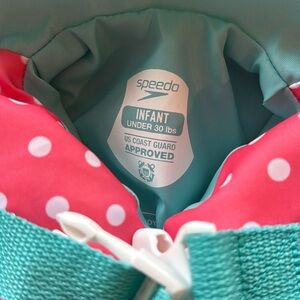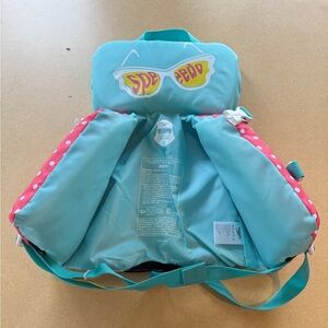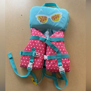 Fun and colorful life jacket for kids. Features a red polka dot design with teal straps. Perfect for water safety.