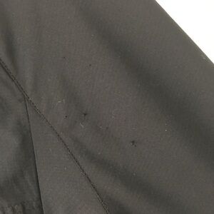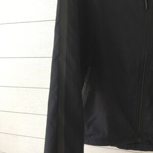 Zip front and zip pockets, hooded jacket. Size L, black. Small catch in fabric to side of right pocket as shown in photos. Item is marked with name as shown in last photo.
