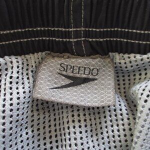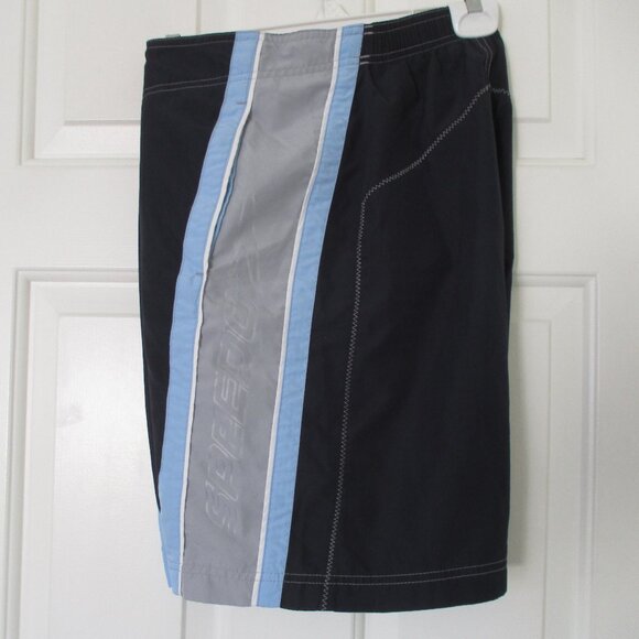 Speedo Mens Navy Blue Gray Mesh-lined Swim Board Short. Twin Side Pockets. Size 30W-32W or Small, Inseam 8", Rise 12.5". 100% Polyester in Navy/Blue/Gray. Previously owned and lightly used, no sign of wear, stain or defect.