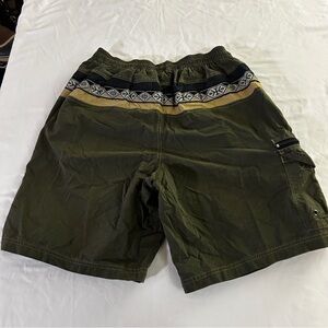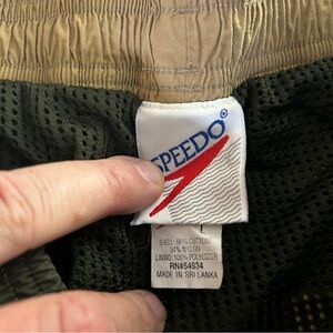 Olive and beige Speedo swim trunks. Ideal for water activities.