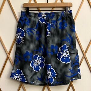 Speedo swim trunks with mesh briefs. Gray with blue tropical floral pattern. Size L