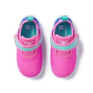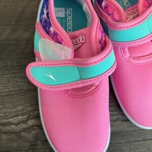 New with tags (NWT) Speedo kids large (9-10) toddler girls aqua sock water shoes. Colorway is primarily hot pink with accents in aqua and purple including the mermaid scale print near heel. Velcro strap across top of foot is easy for on and off.